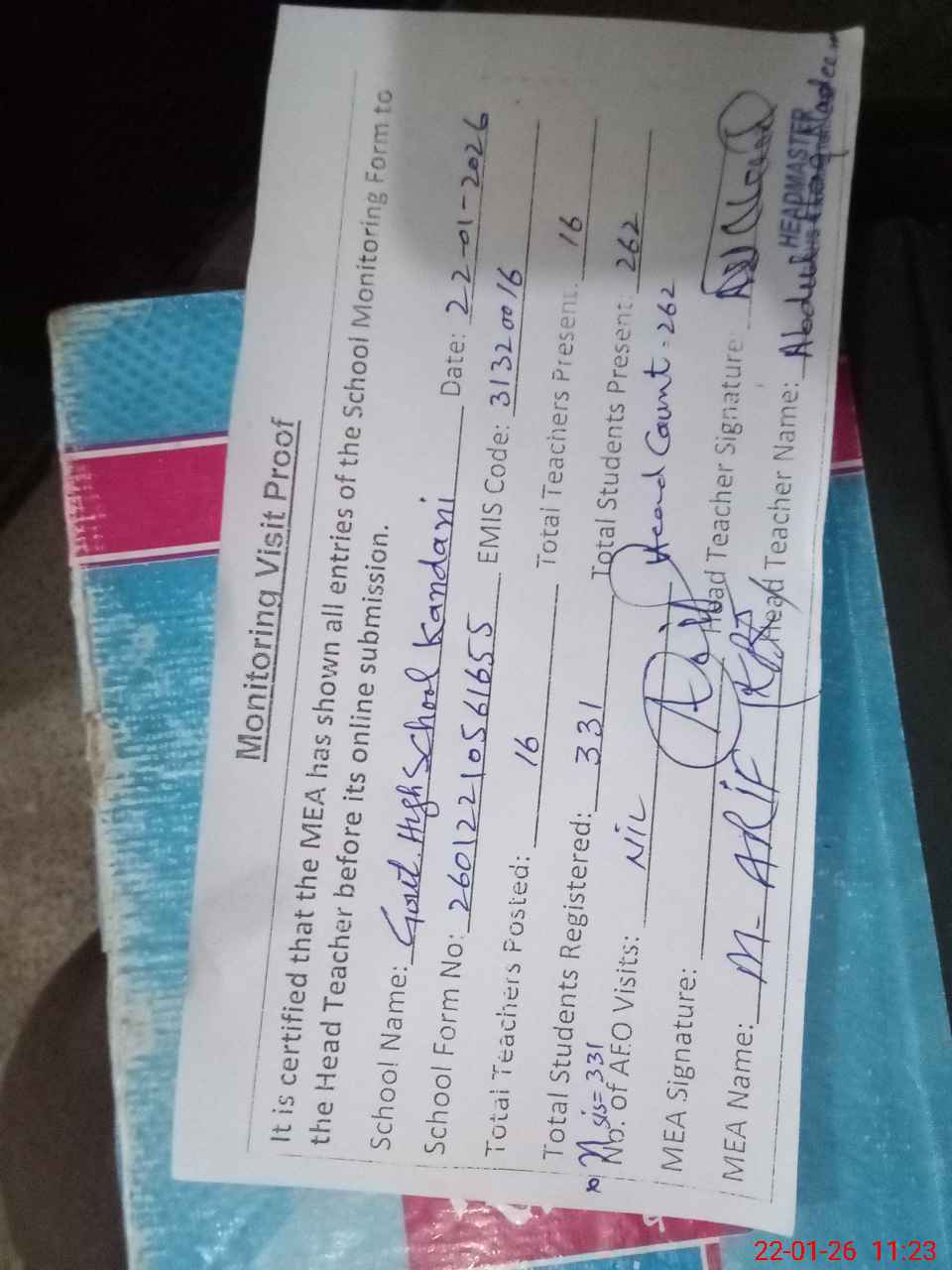 | Attendance Register | Head Teacher | MEA with School | Visit Proof |