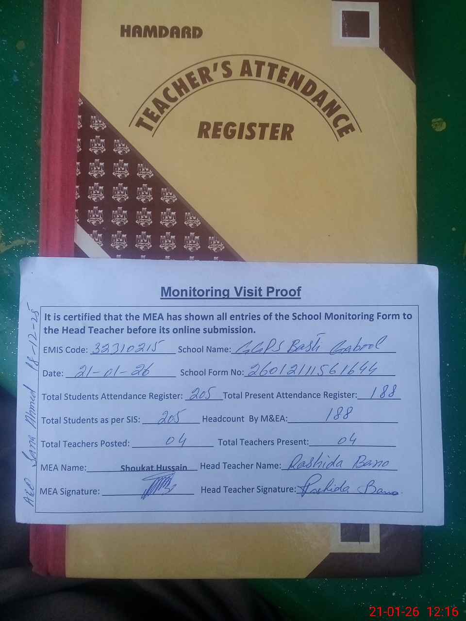 | Attendance Register | Head Teacher | MEA with School | Visit Proof |