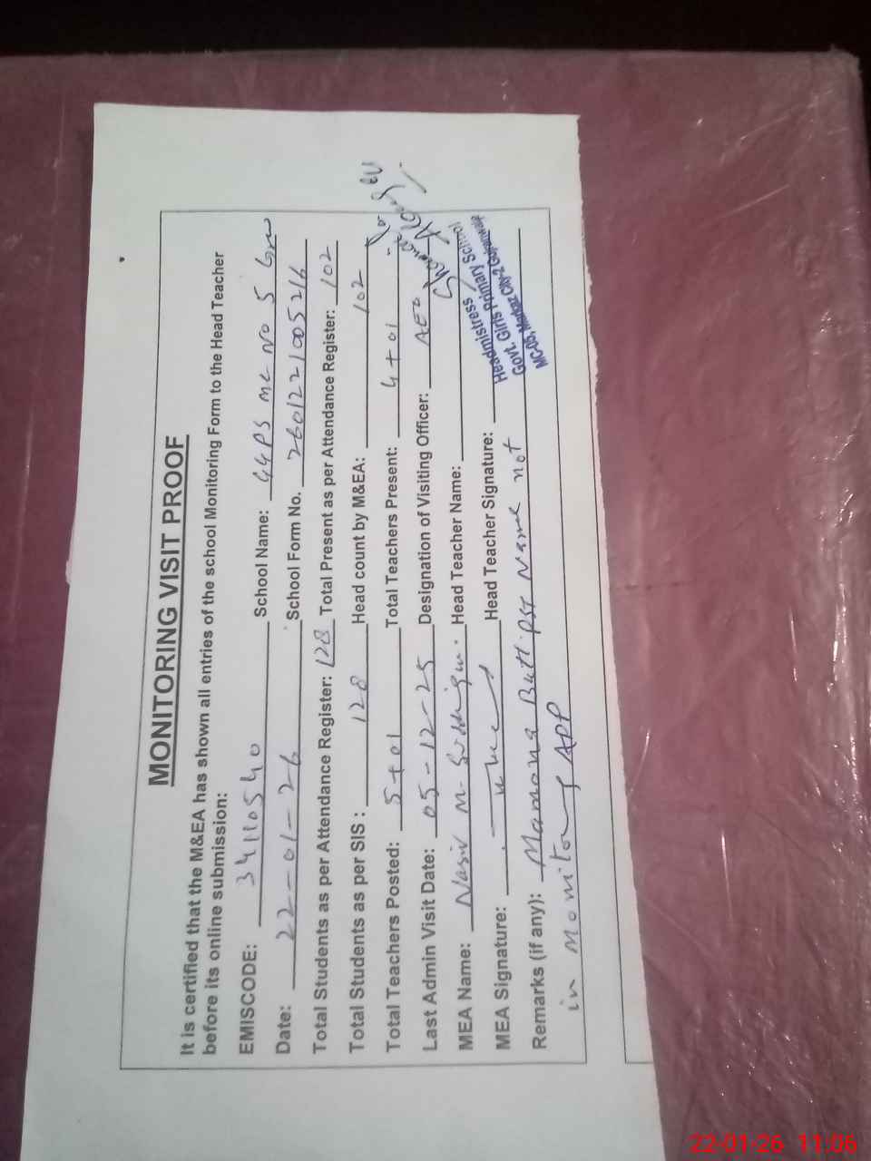 | Attendance Register | Head Teacher | MEA with School | Visit Proof |