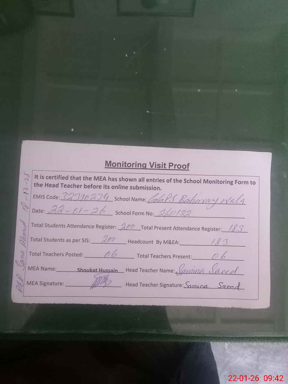 | Attendance Register | Head Teacher | MEA with School | Visit Proof |