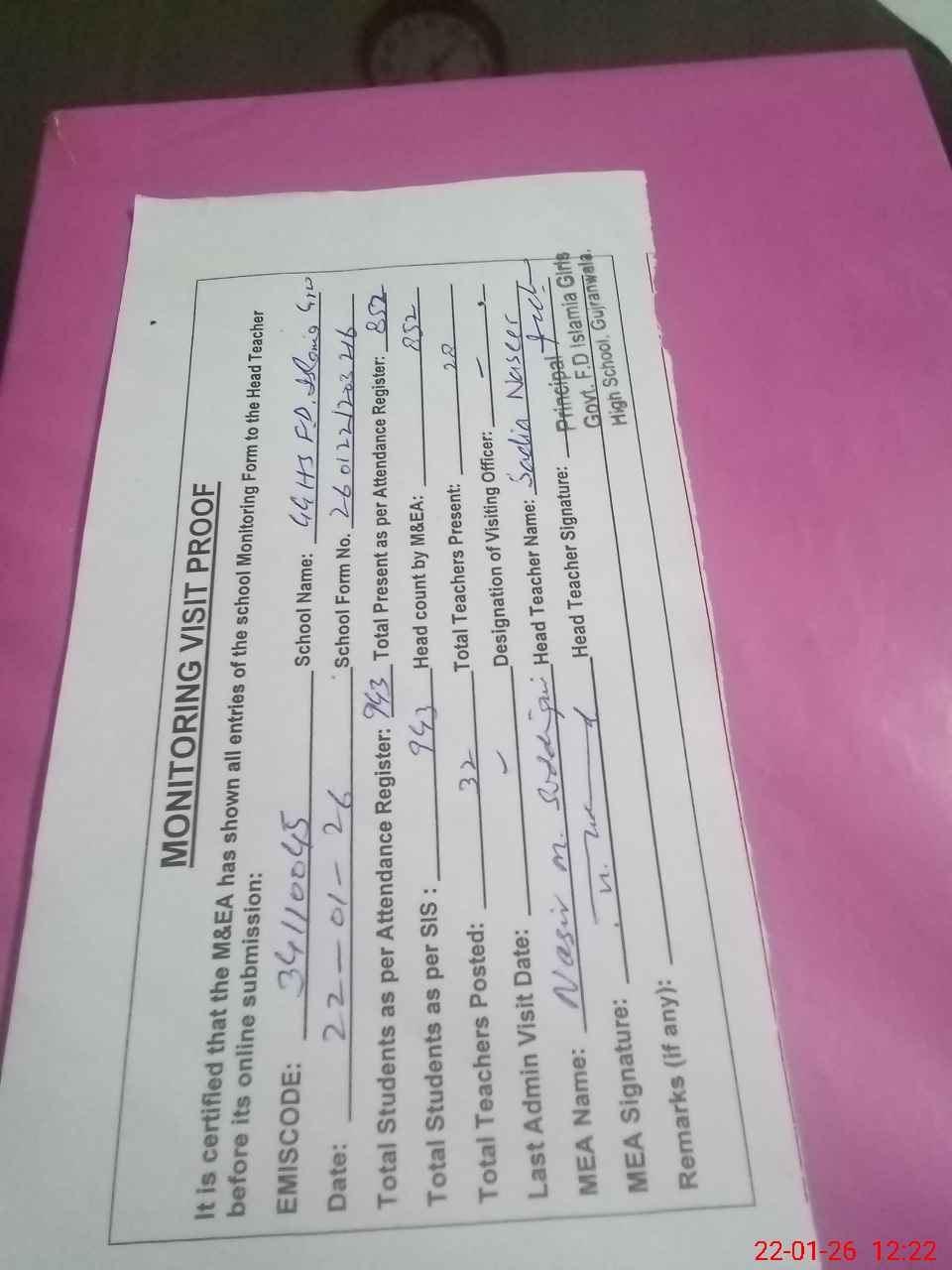 | EMIS Code: 34110045 | Name of School: GGHS F.D. ISLAMIA GUJRANWALA | |||