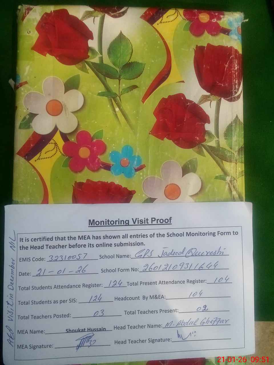 | Attendance Register | Head Teacher | MEA with School | Visit Proof |