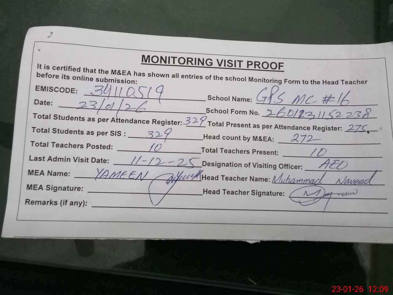 | Attendance Register | Head Teacher | MEA with School | Visit Proof |