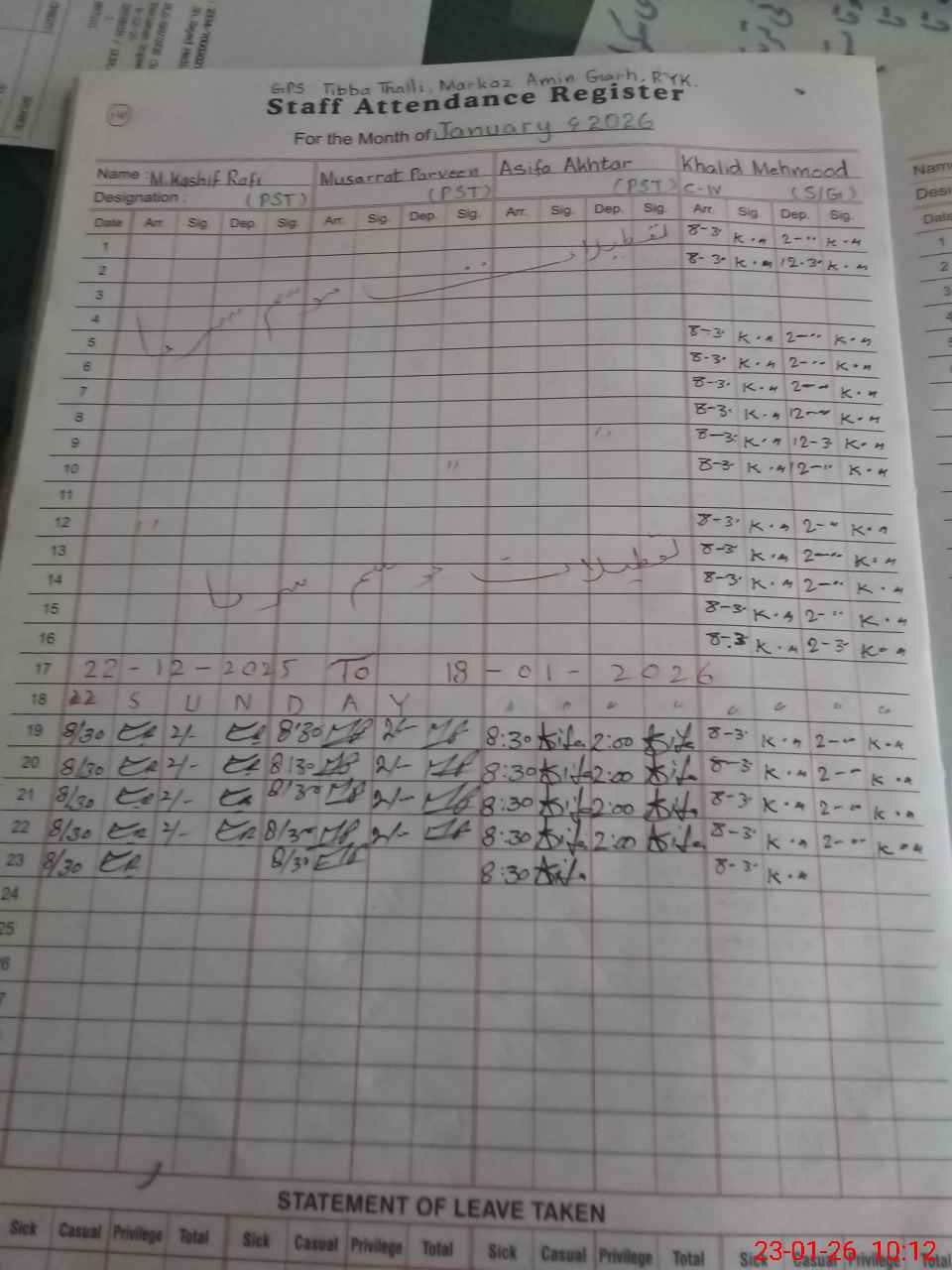 | CNIC | Full Name | Designation | R/C | Absence During Last Calender Month |