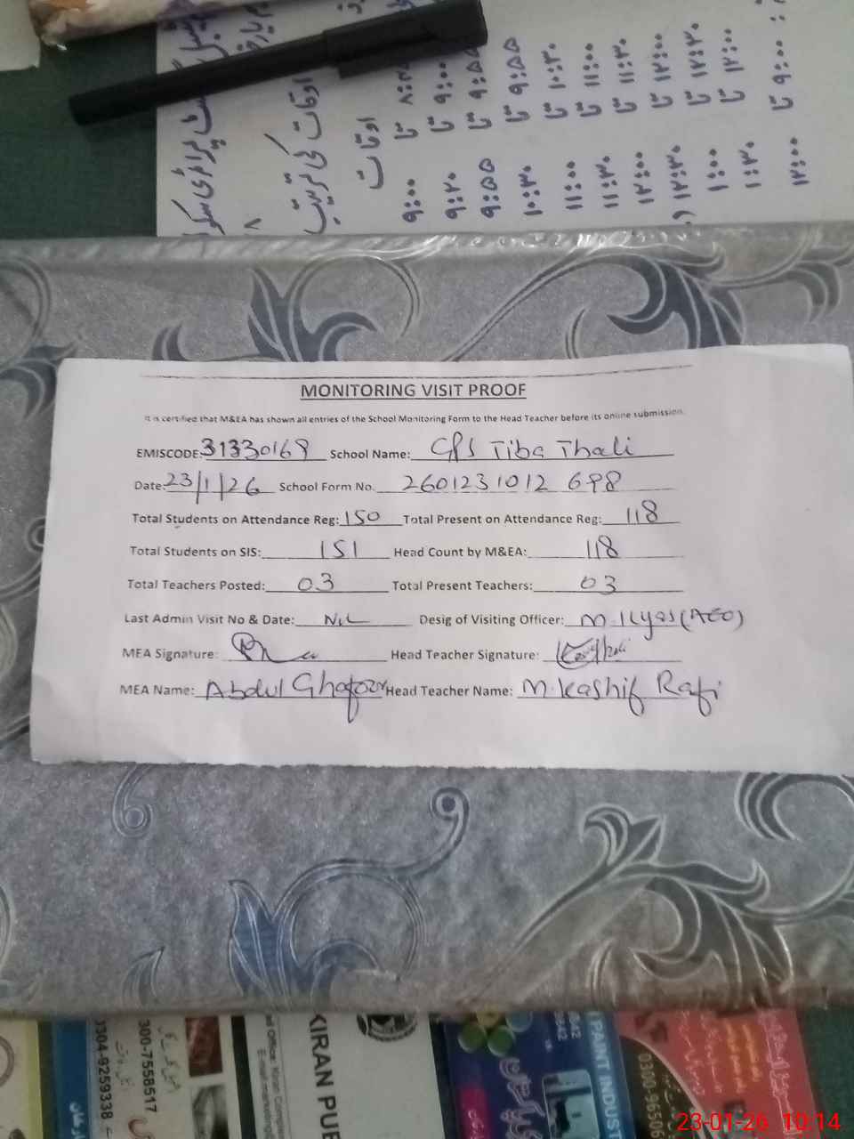 | Attendance Register | Head Teacher | MEA with School | Visit Proof |