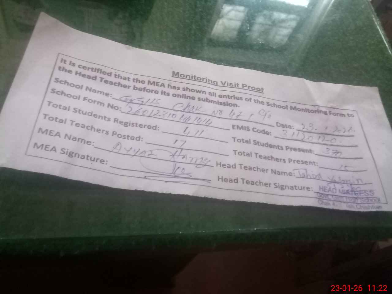 | Attendance Register | Head Teacher | MEA with School | Visit Proof |