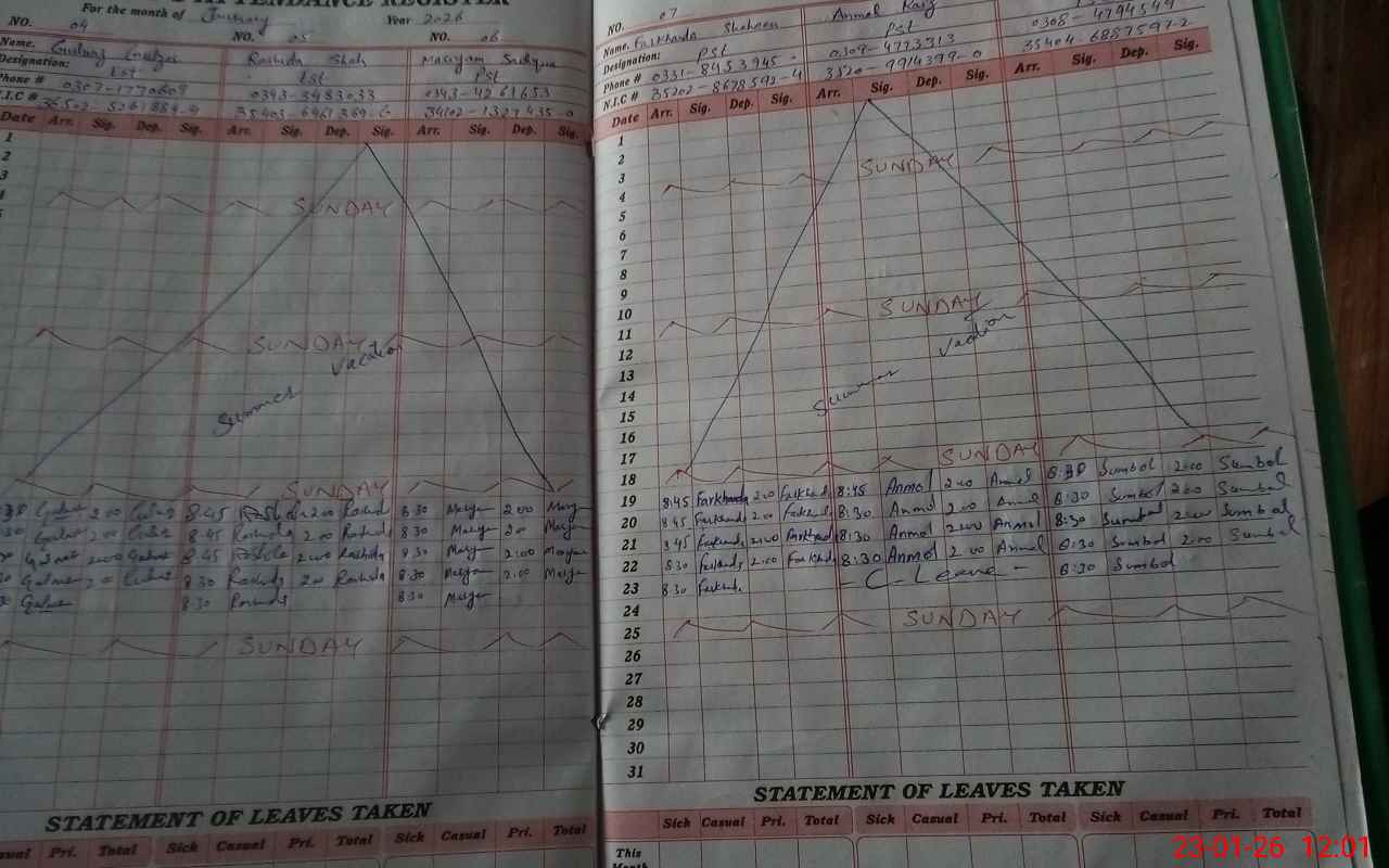 | CNIC | Full Name | Designation | R/C | Absence During Last Calender Month |
