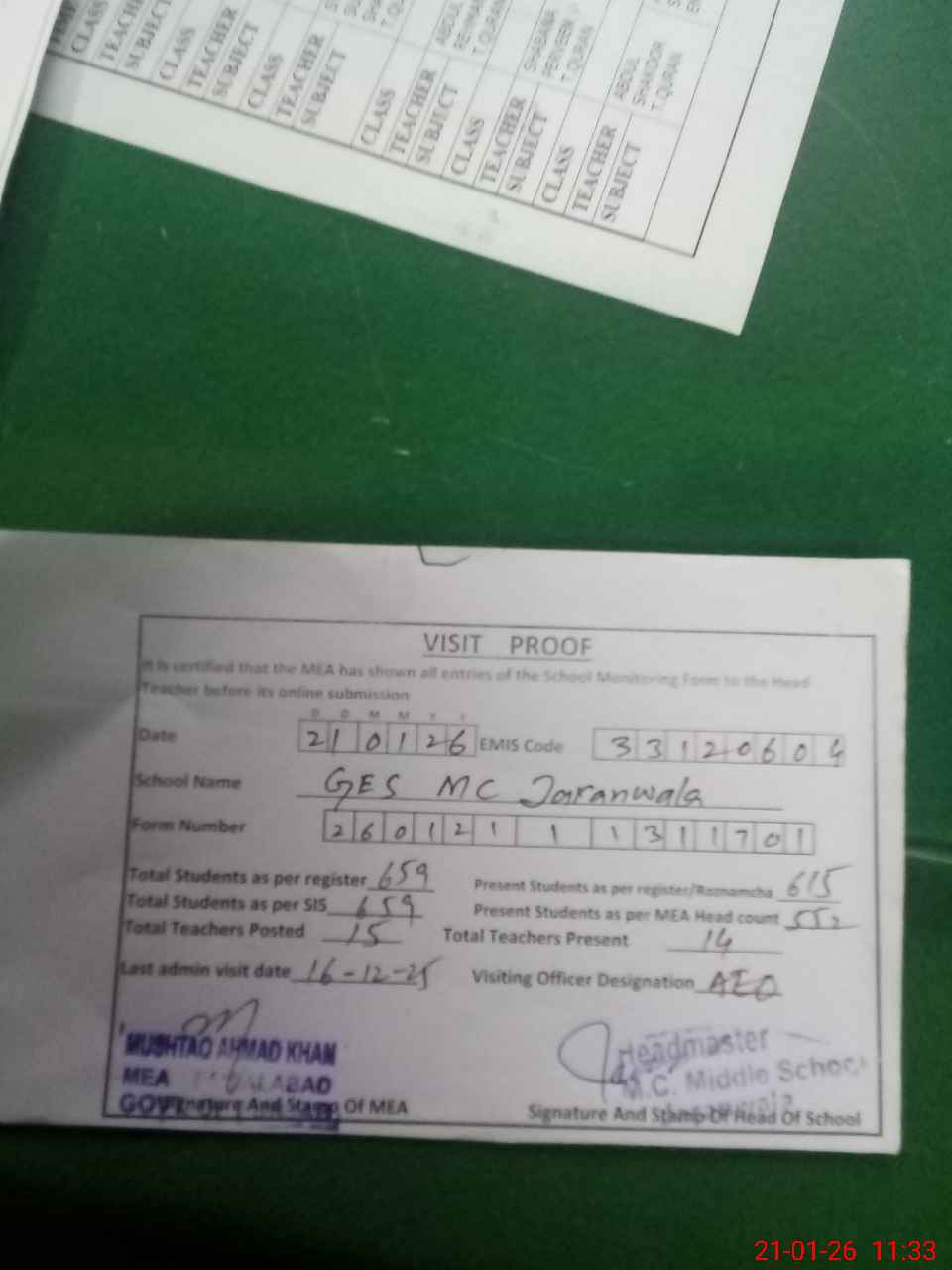 | Attendance Register | Head Teacher | MEA with School | Visit Proof |