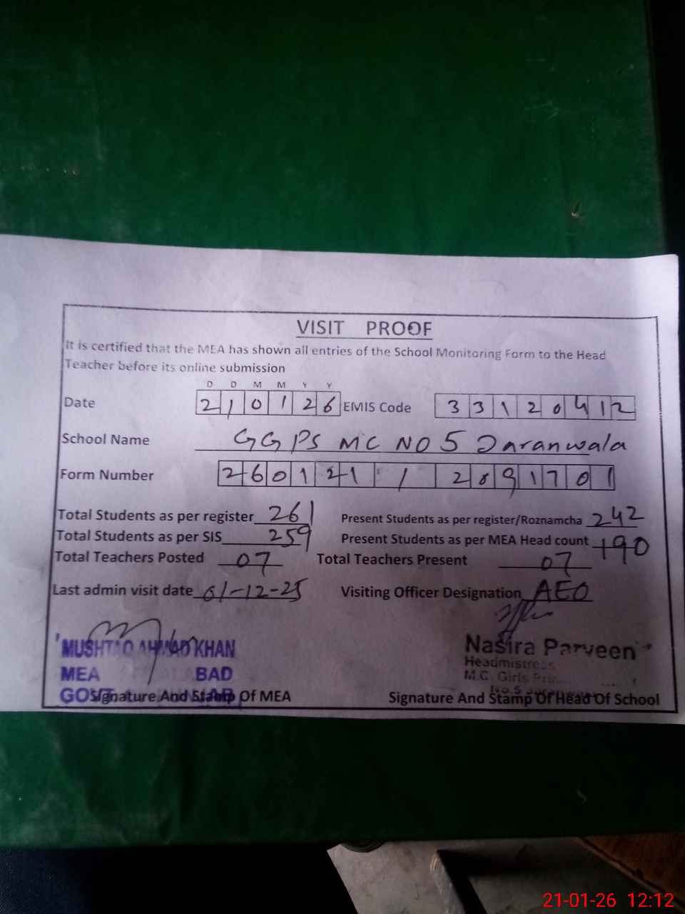 | Attendance Register | Head Teacher | MEA with School | Visit Proof |