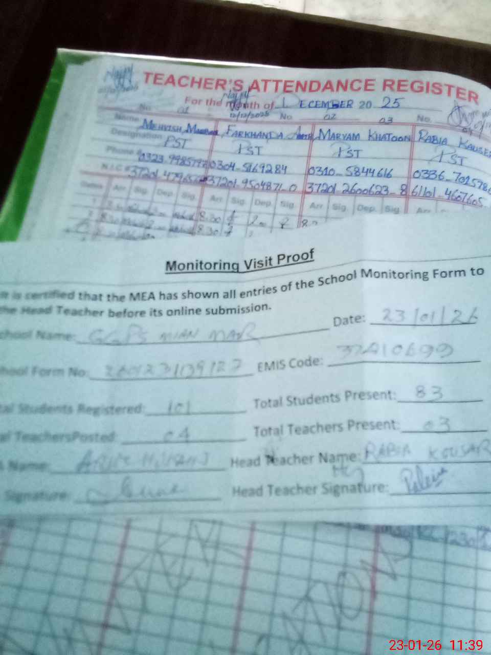 | Attendance Register | Head Teacher | MEA with School | Visit Proof |