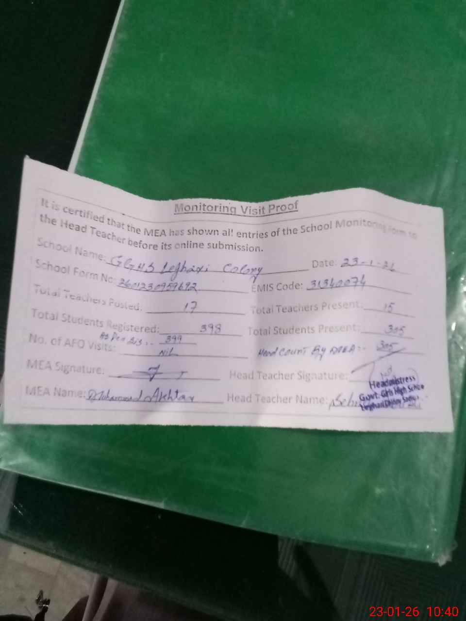 | EMIS Code: 31340074 | Name of School: GGHS LEGHARI COLONY | |||