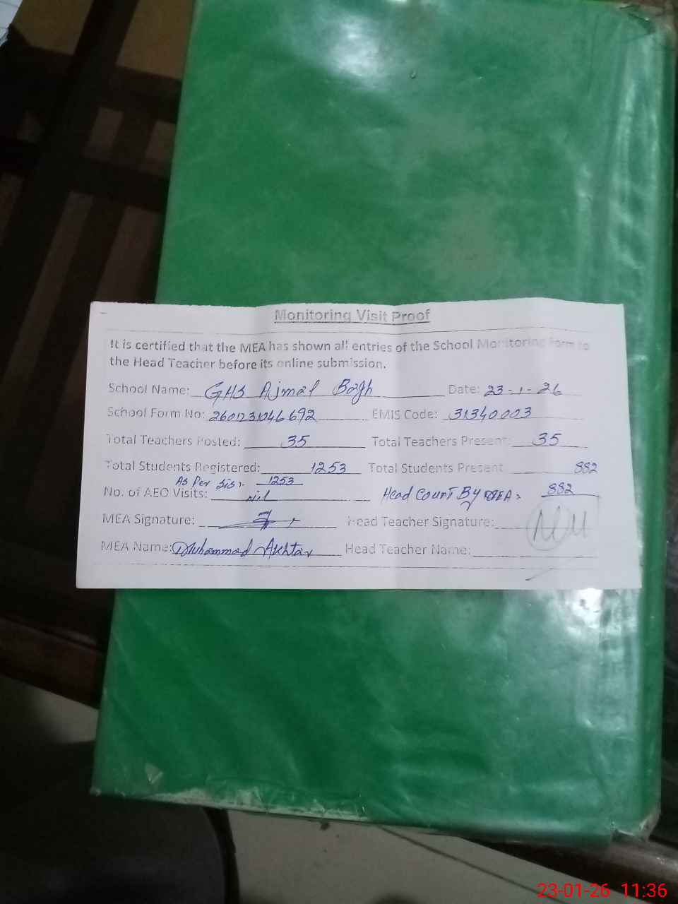 | Attendance Register | Head Teacher | MEA with School | Visit Proof |