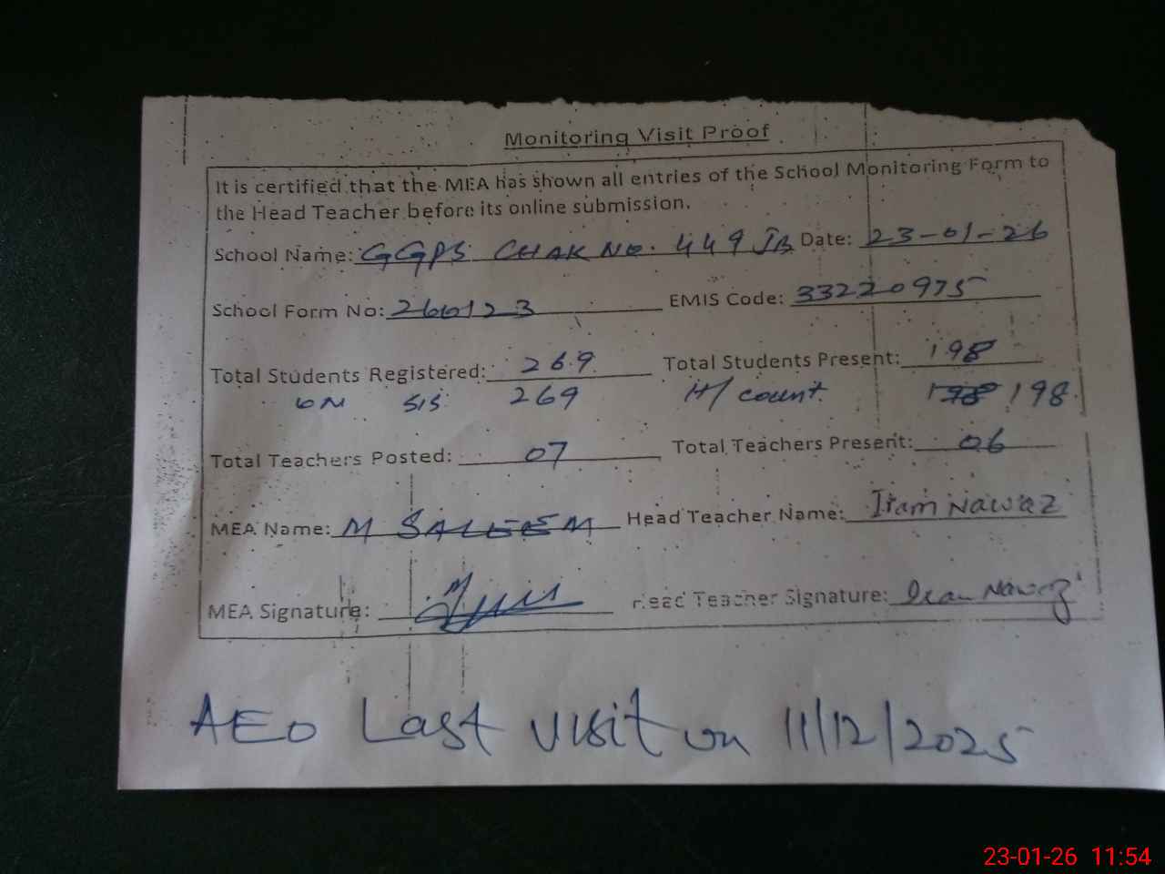 | Attendance Register | Head Teacher | MEA with School | Visit Proof |
