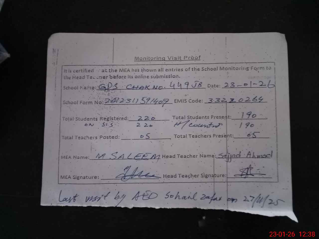 | EMIS Code: 33220264 | Name of School: GPS CHAK NO 449 JB | |||