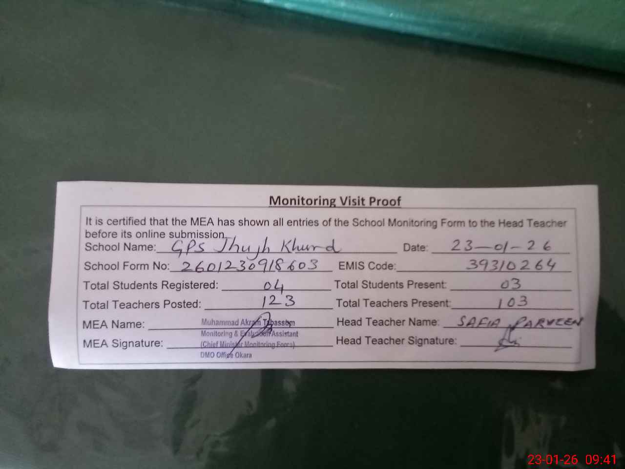 | Attendance Register | Head Teacher | MEA with School | Visit Proof |
