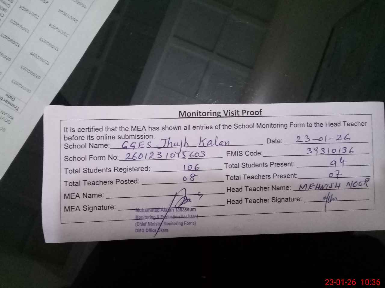| Attendance Register | Head Teacher | MEA with School | Visit Proof |