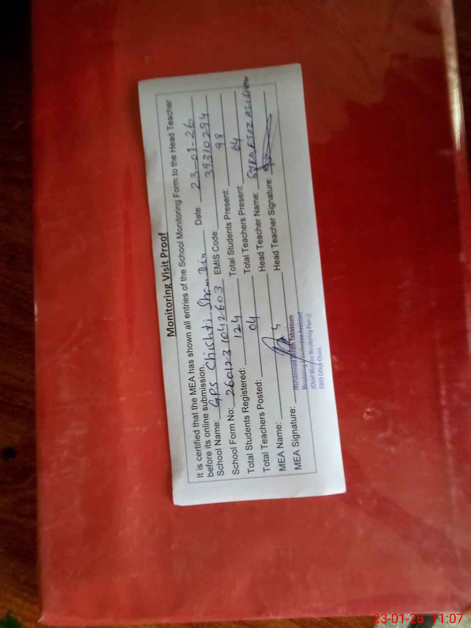 | Attendance Register | Head Teacher | MEA with School | Visit Proof |