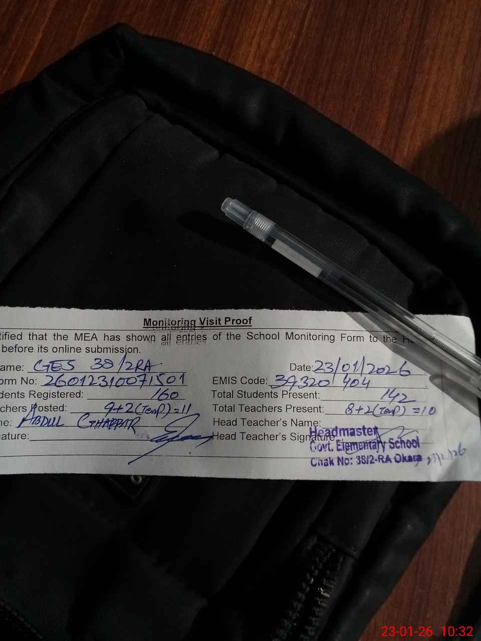| Attendance Register | Head Teacher | MEA with School | Visit Proof |