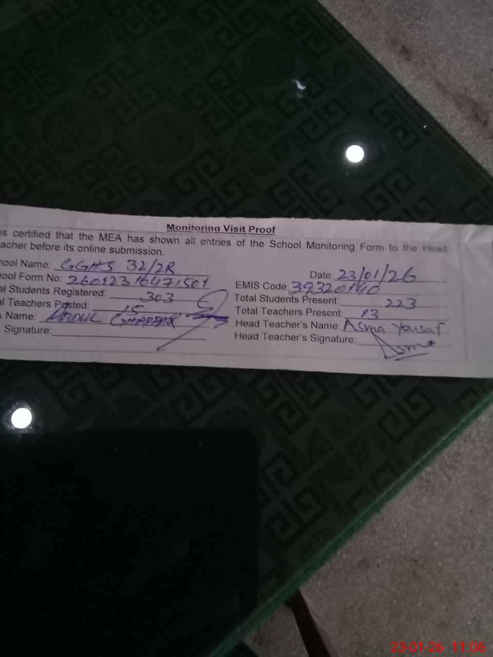 | Attendance Register | Head Teacher | MEA with School | Visit Proof |