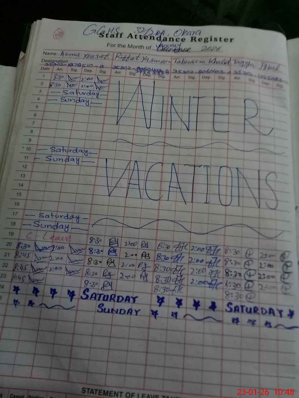 | CNIC | Full Name | Designation | R/C | Absence During Last Calender Month |