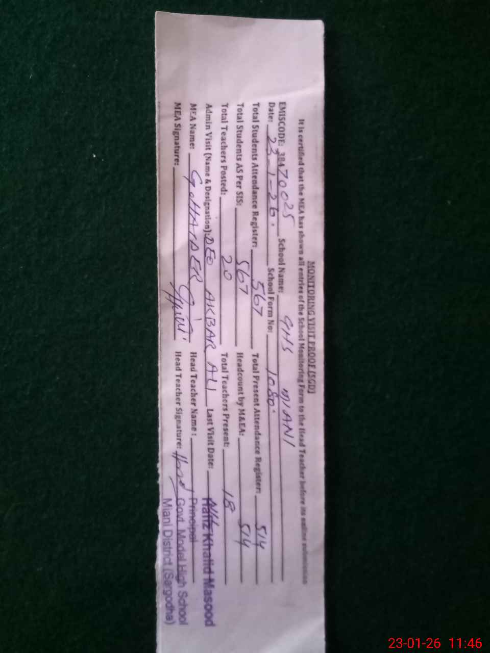 | Attendance Register | Head Teacher | MEA with School | Visit Proof |
