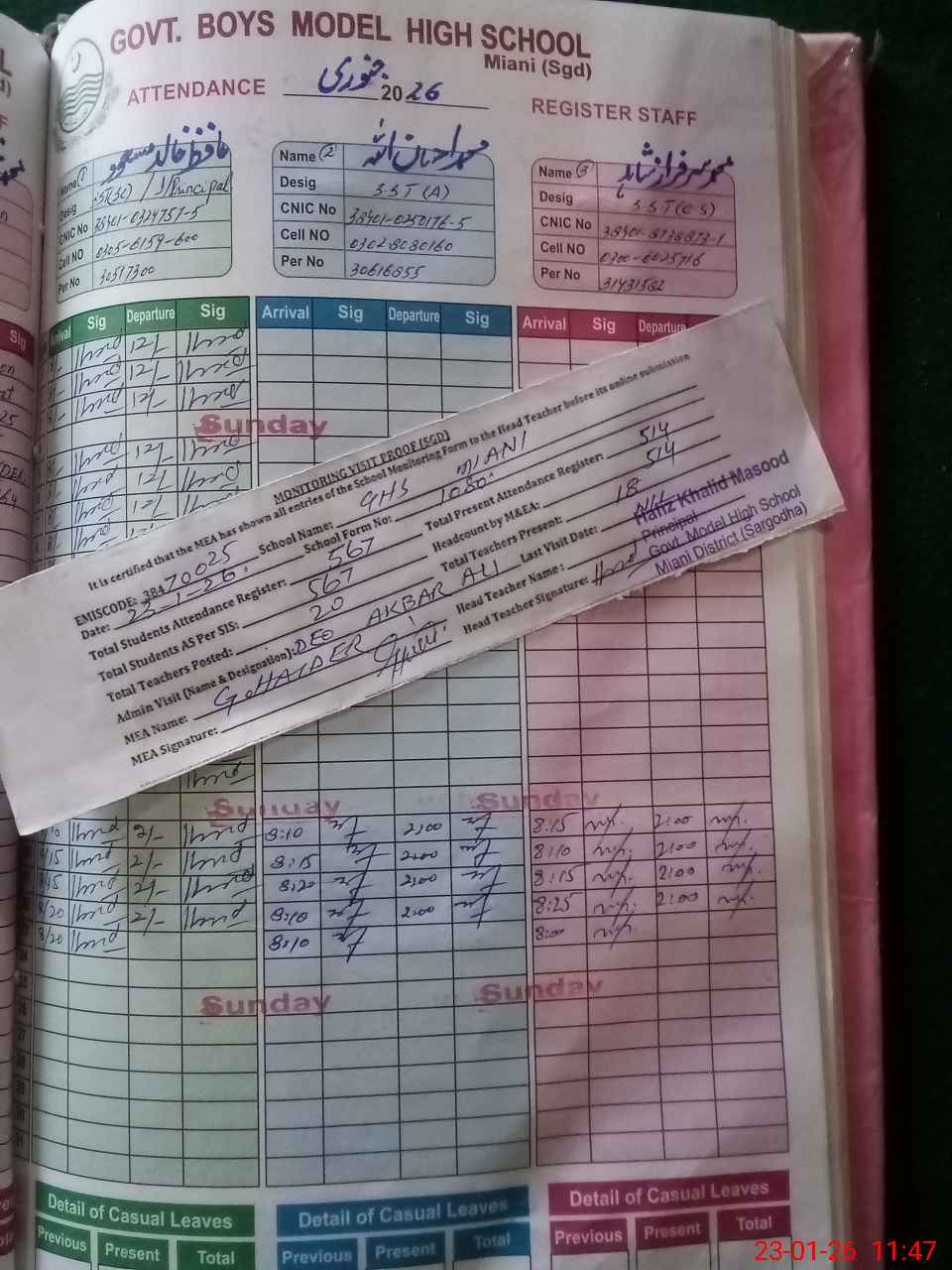 | CNIC | Full Name | Designation | R/C | Absence during last cal. month |