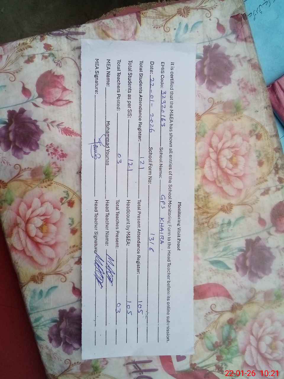 | Attendance Register | Head Teacher | MEA with School | Visit Proof |