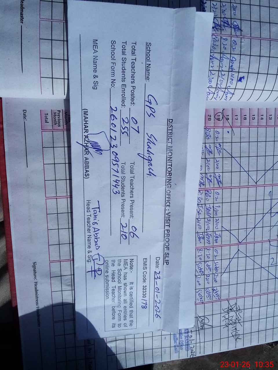 | Attendance Register | Head Teacher | MEA with School | Visit Proof |
