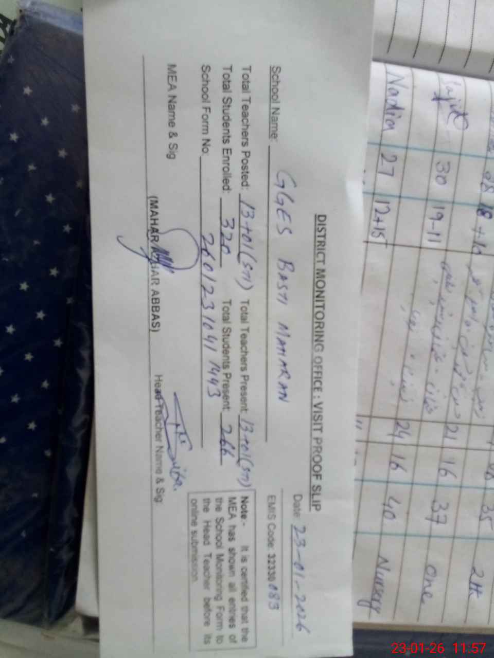 | Attendance Register | Head Teacher | MEA with School | Visit Proof |