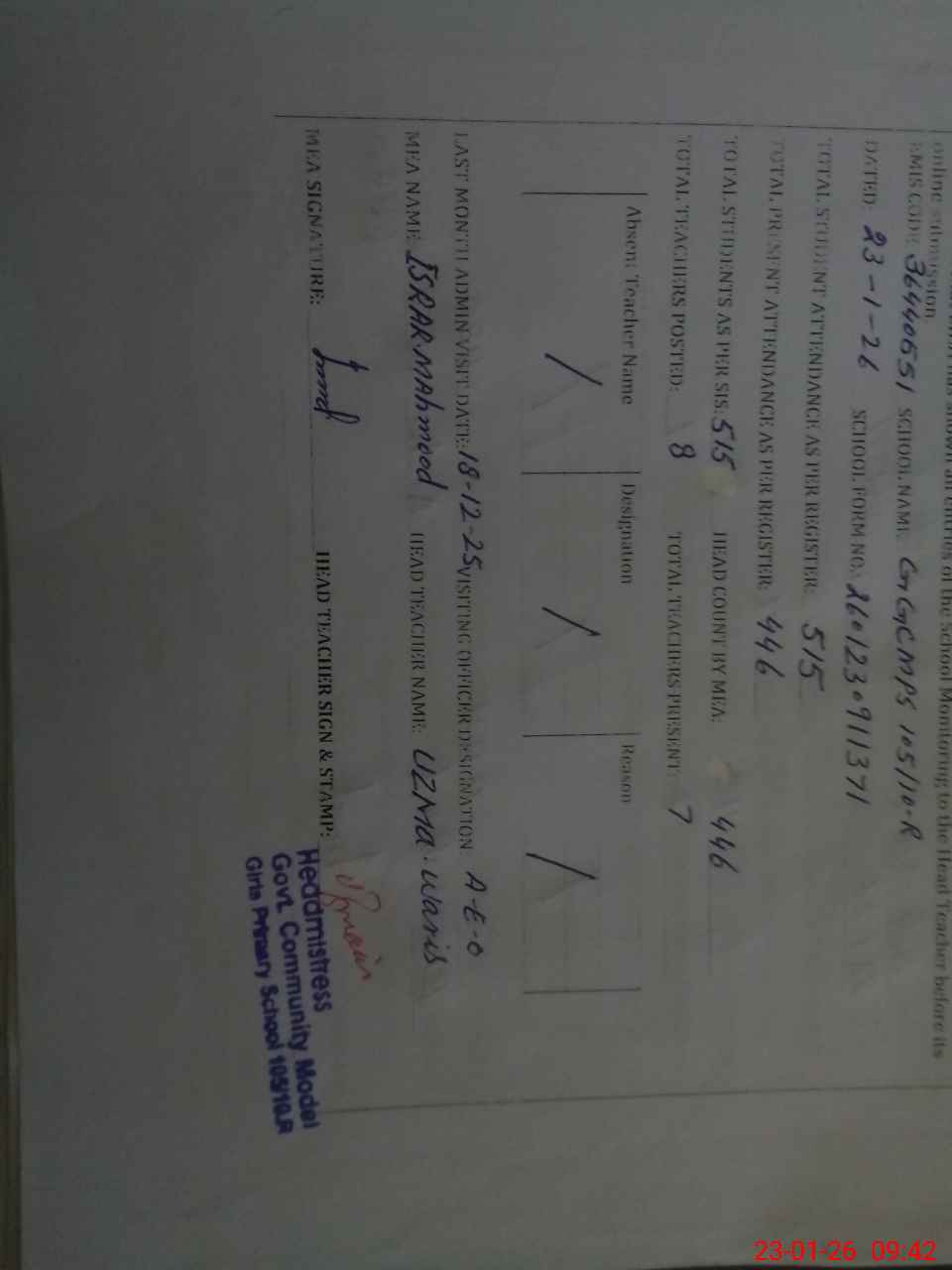 | Attendance Register | Head Teacher | MEA with School | Visit Proof |