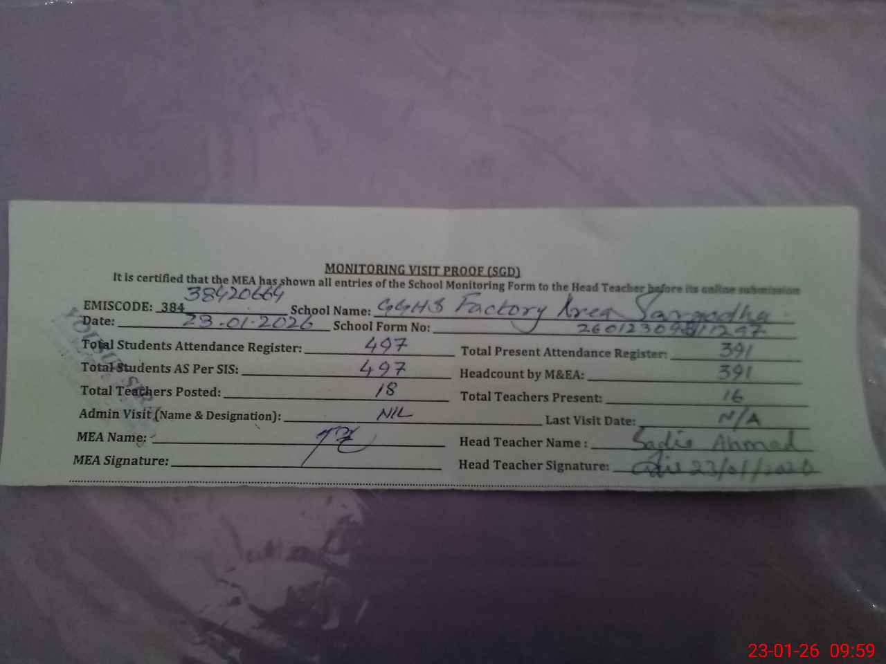 | EMIS Code: 38420664 | Name of School: GGHS FACTORY AREA SARGODHA | |||