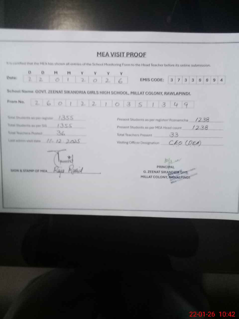| Certified that this School was Inspected by the Undersigned MEA/DMO Today and the Information Stated Above is as Per Record. | |||||