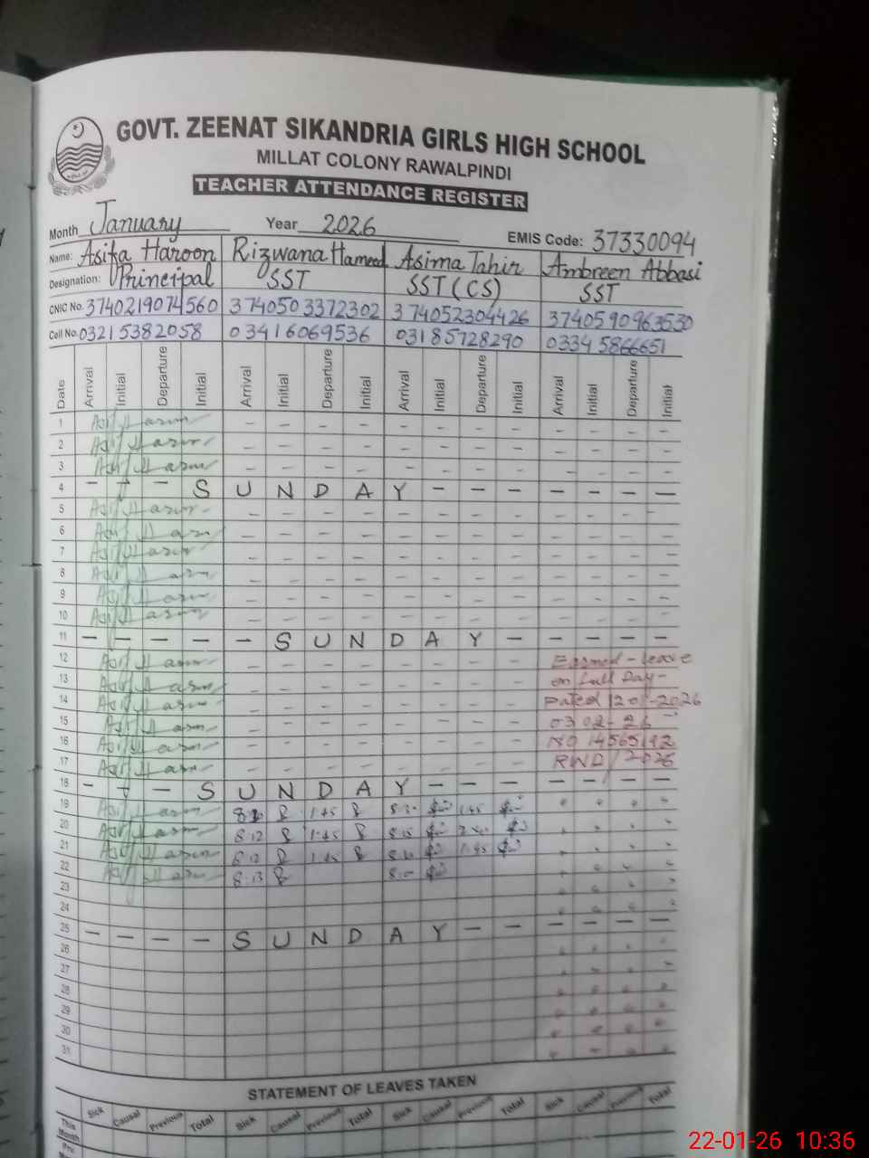| EMIS Code: 37330094 | Name of School: GGHS ZINAT SIKANDRIA RWP | |||