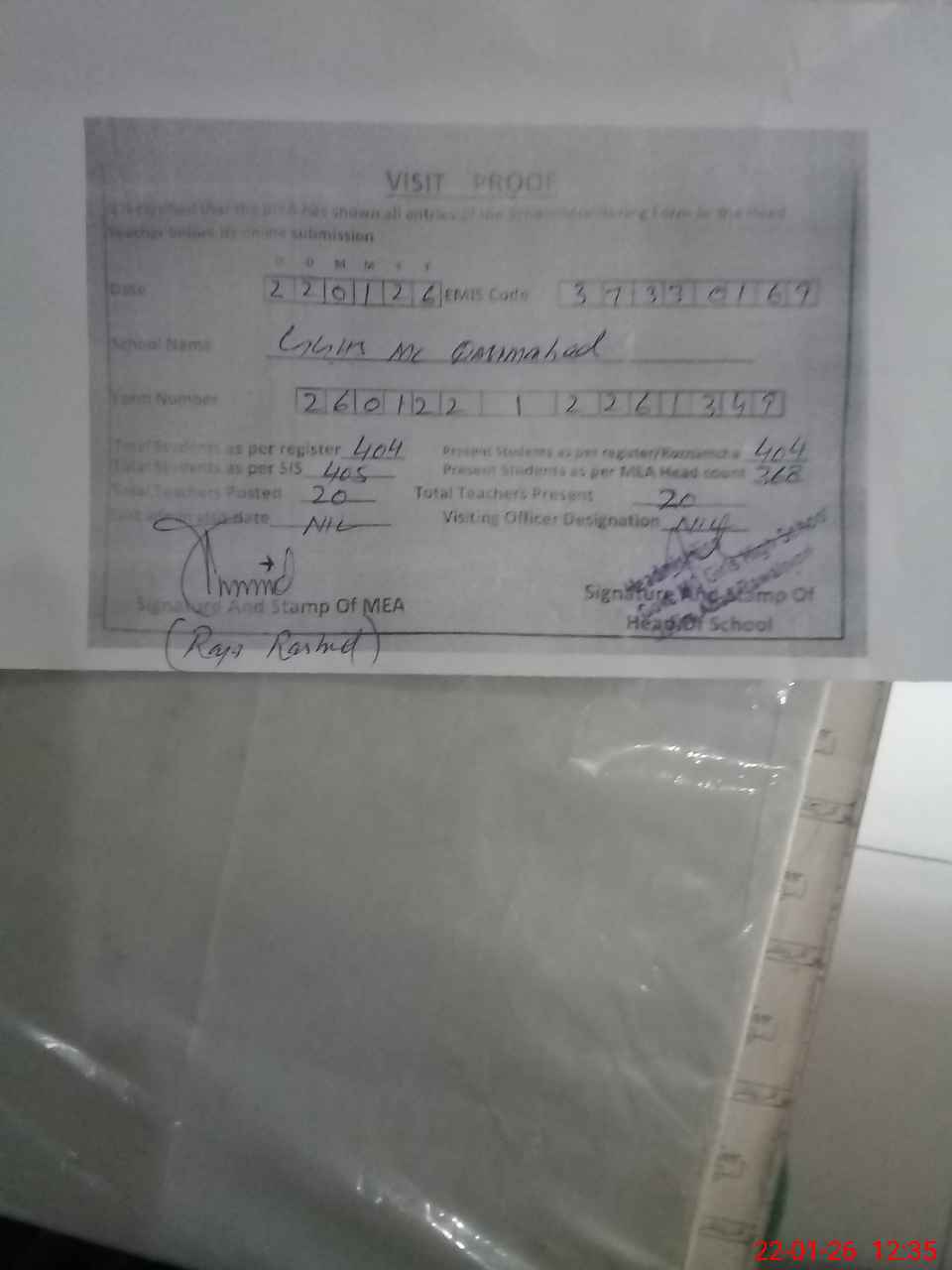 | Attendance Register | Head Teacher | MEA with School | Visit Proof |