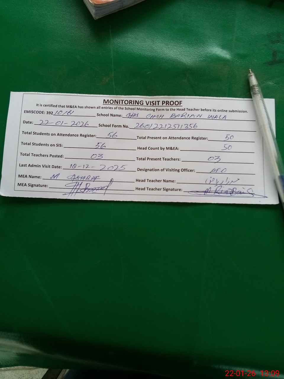 | EMIS Code: 39210161 | Name of School: GPS CHAH BARIAN WALA | |||