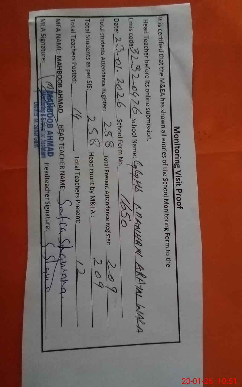 | EMIS Code: 32320476 | Name of School: GGHS MANHAN (ARAIN WALA) | |||