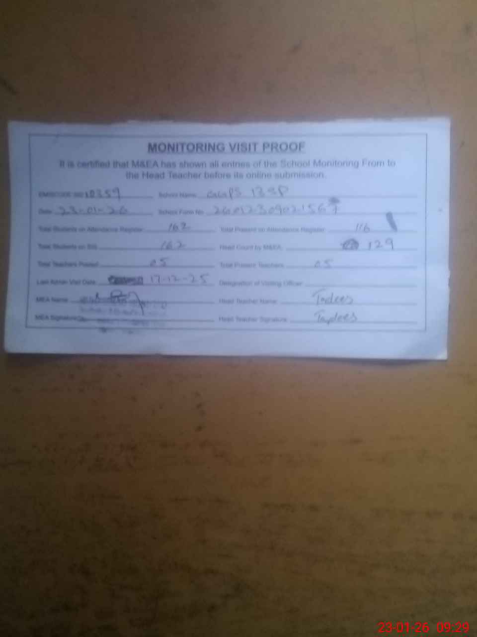 | Attendance Register | Head Teacher | MEA with School | Visit Proof |