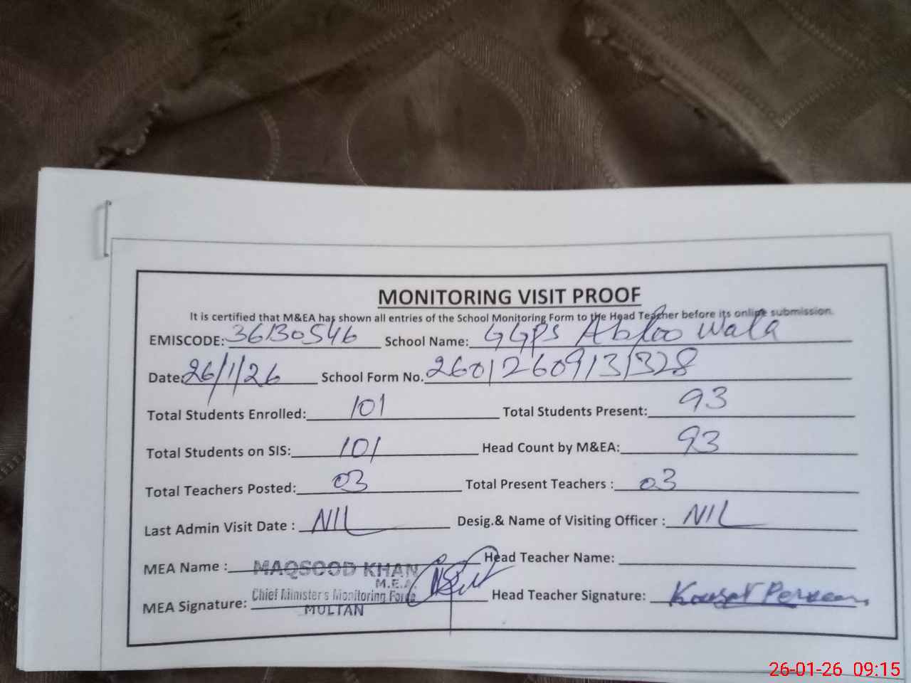 | Attendance Register | Head Teacher | MEA with School | Visit Proof |