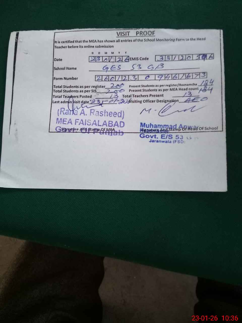 | Attendance Register | Head Teacher | MEA with School | Visit Proof |