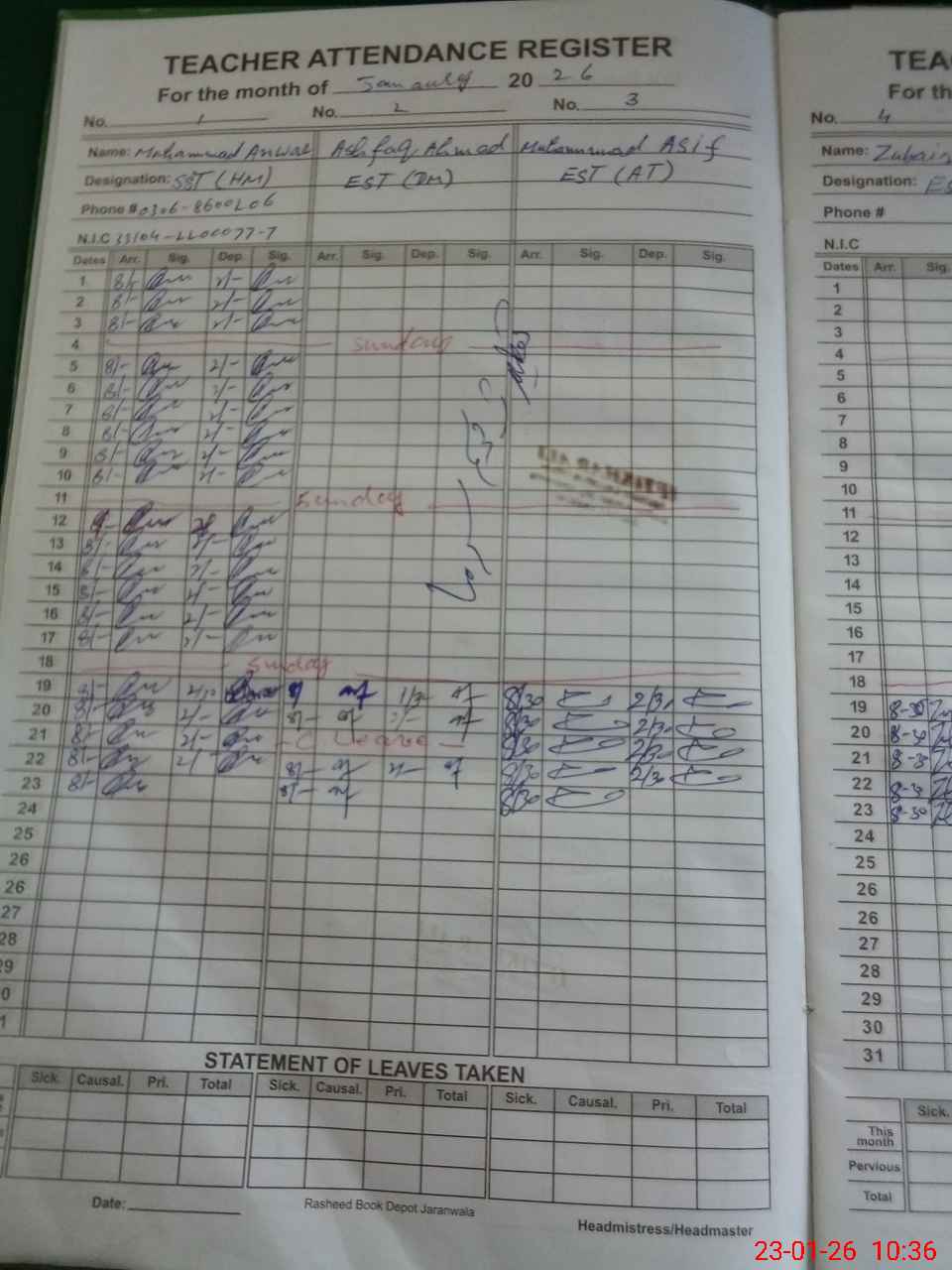 | Name: MU**** AN**** Designation: (School Headmaster's/Headmistress's) SST ARTS Phone/Cell Number: 03**** |
