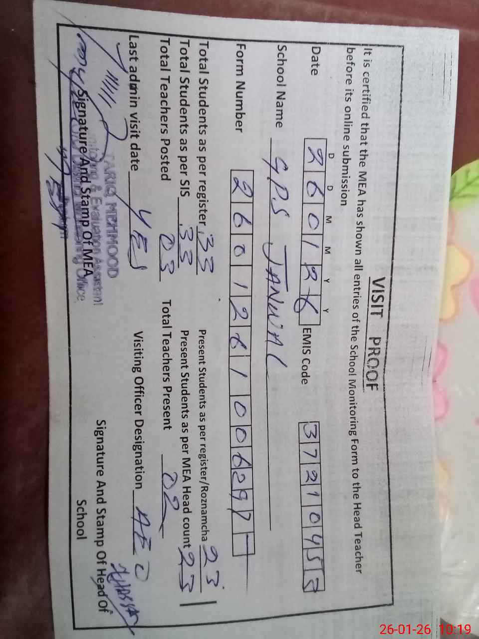 | Certified that this School was Inspected by the Undersigned MEA/DMO Today and the Information Stated Above is as Per Record. | |||||