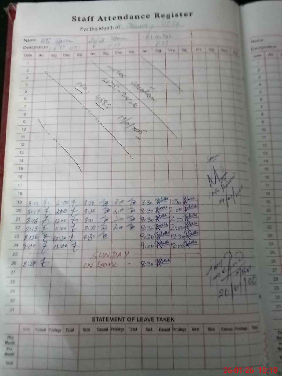 | Leave | Duty | Absent | Maternity | Medical | Ex- Pak |