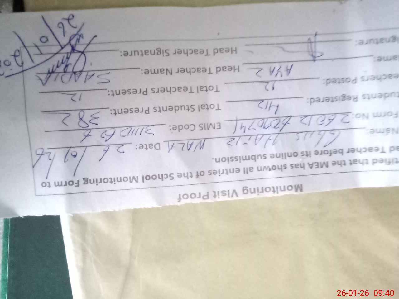 | Attendance Register | Head Teacher | MEA with School | Visit Proof |