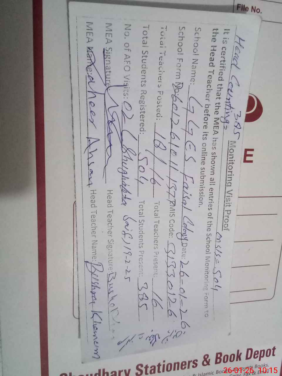 | Attendance Register | Head Teacher | MEA with School | Visit Proof |