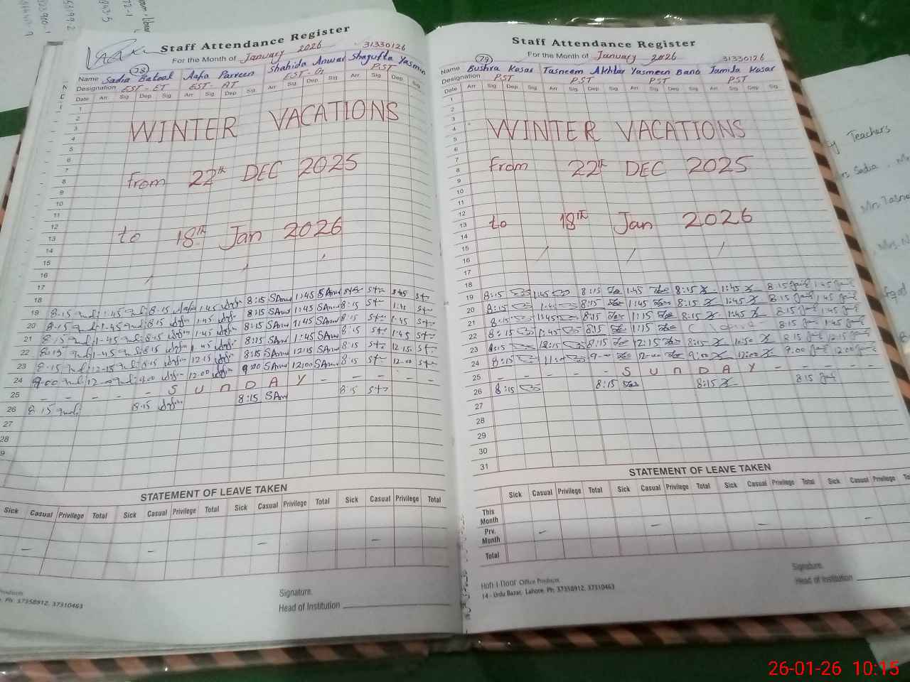 | Leave | Duty | Absent | Maternity | Medical | Ex- Pak |