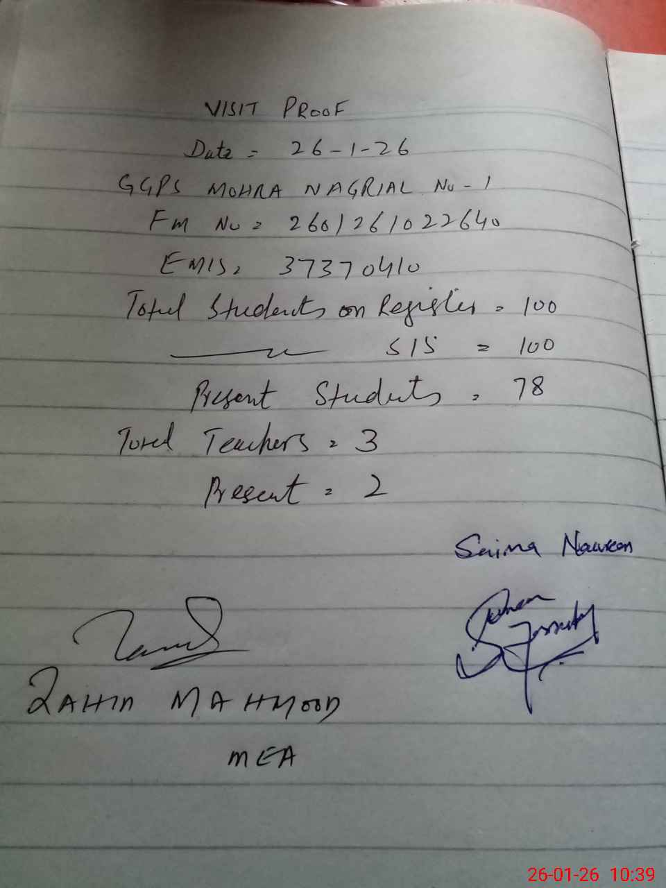 | Attendance Register | Head Teacher | MEA with School | Visit Proof |