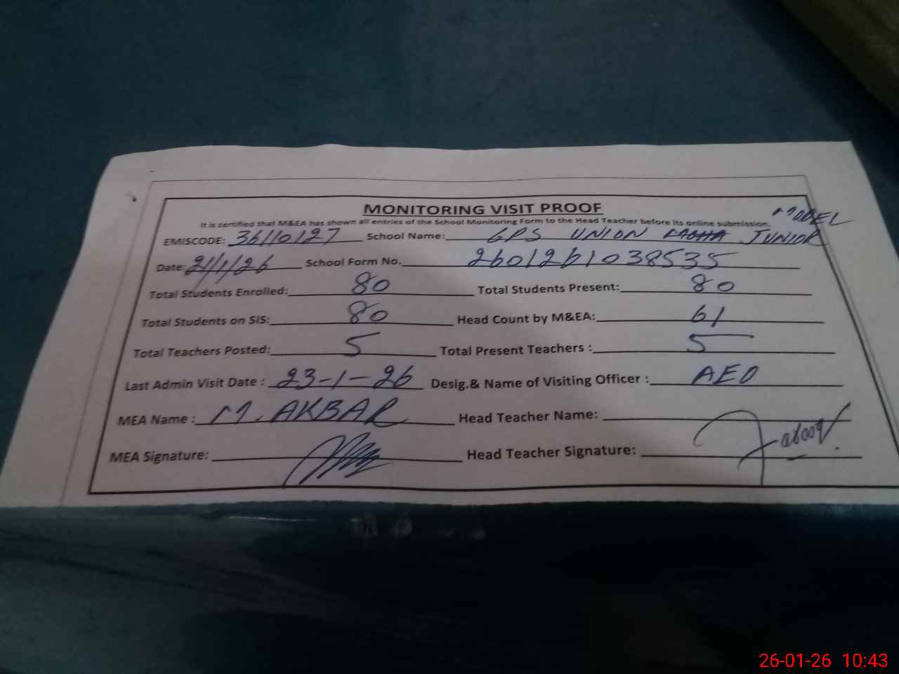 | EMIS Code: 36110127 | Name of School: GPS UNION JUNIOR MODEL. MUHALLAH TIBBI SHER KHAN | |||