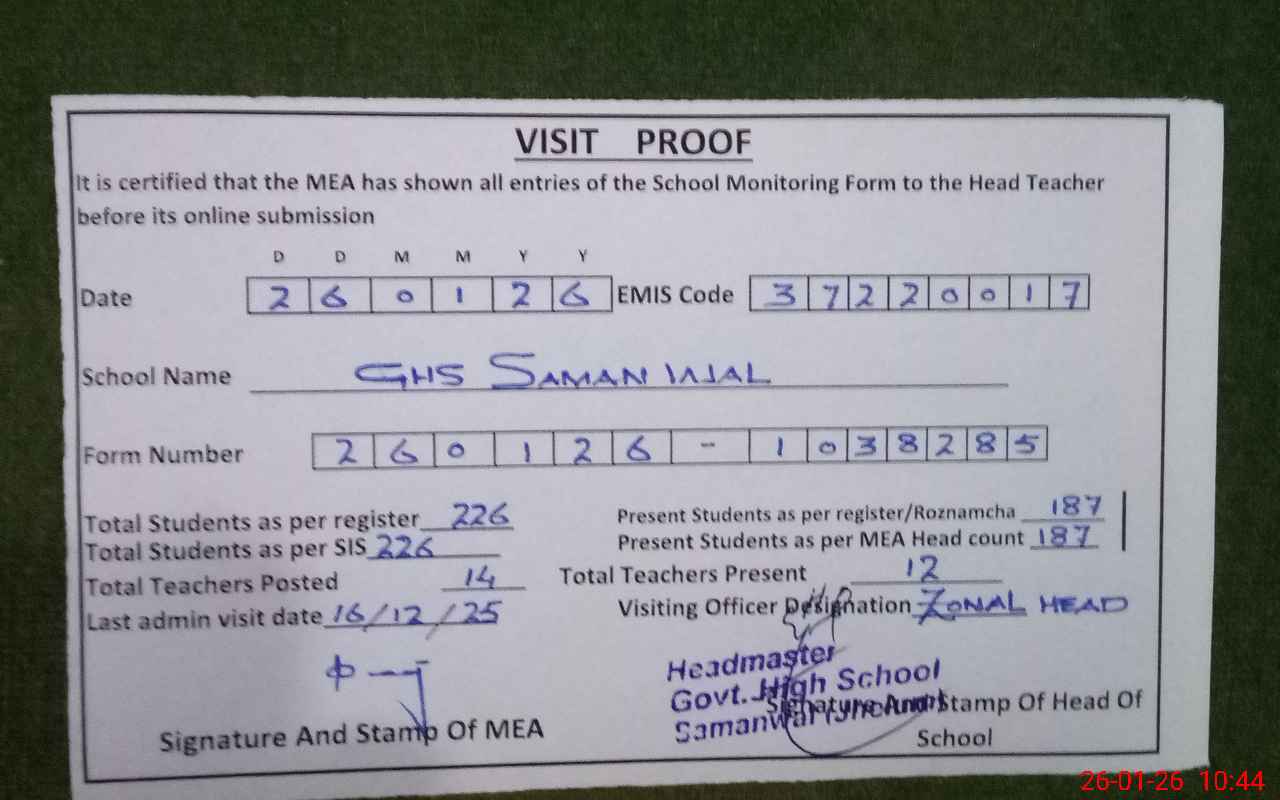 | EMIS Code: 37220017 | Name of School: GHS SAMMAN WAL | |||