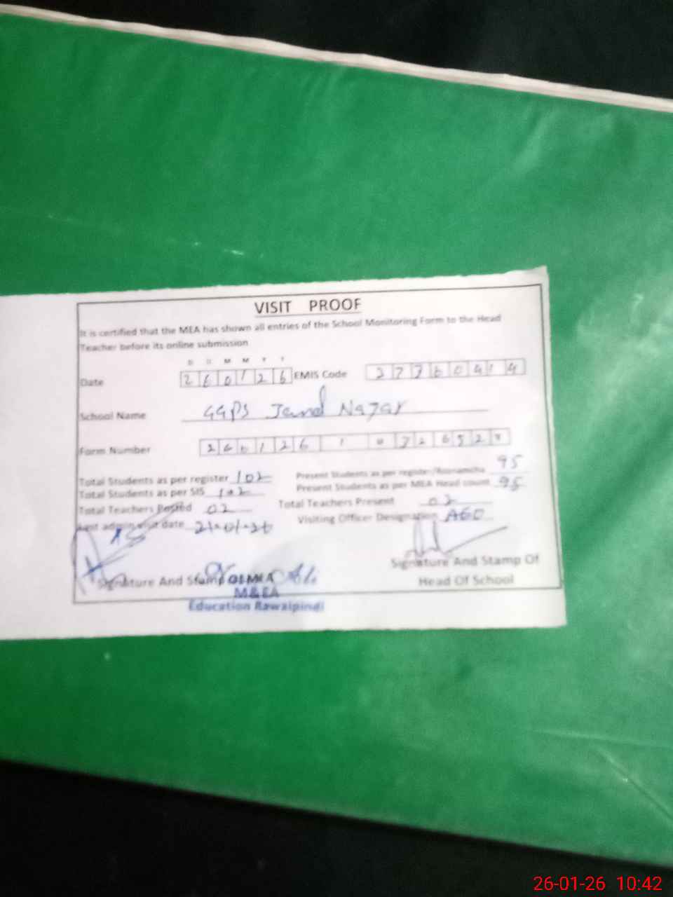 | Attendance Register | Head Teacher | MEA with School | Visit Proof |