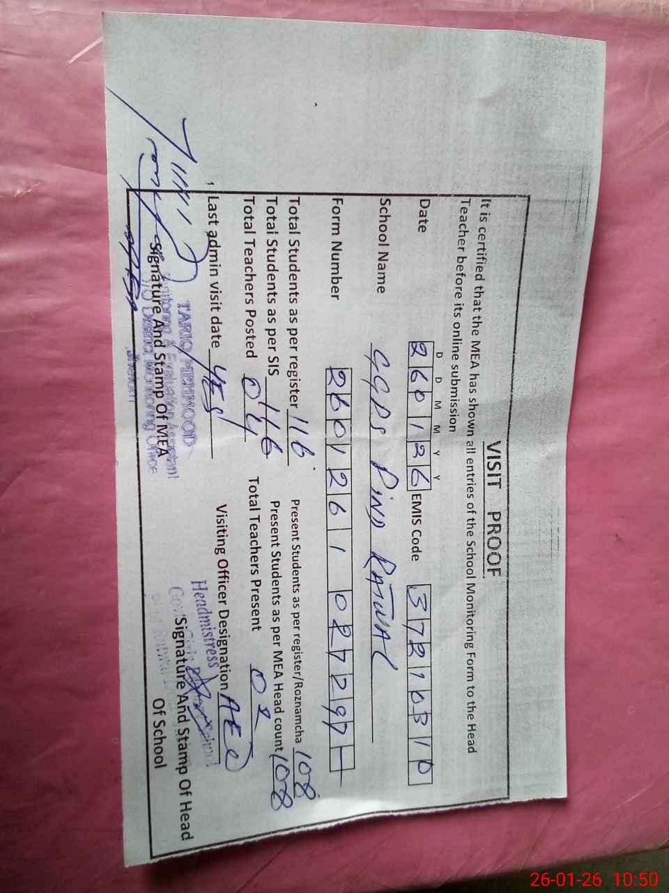 | Certified that this School was Inspected by the Undersigned MEA/DMO Today and the Information Stated Above is as Per Record. | |||||